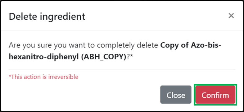 In the ‘Delete ingredient window which opens, click on the ‘Confirm’ button:
