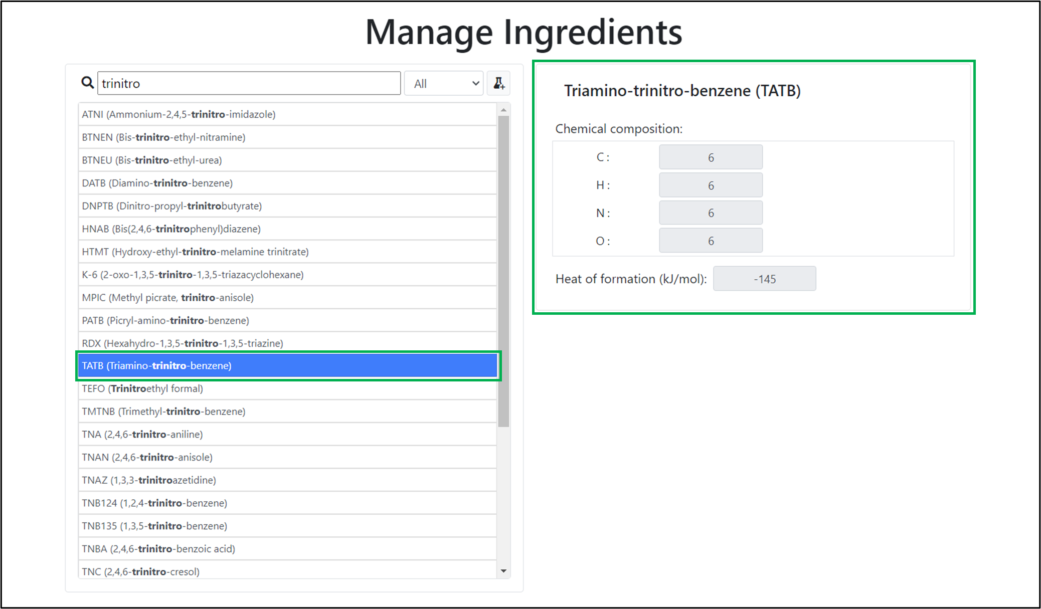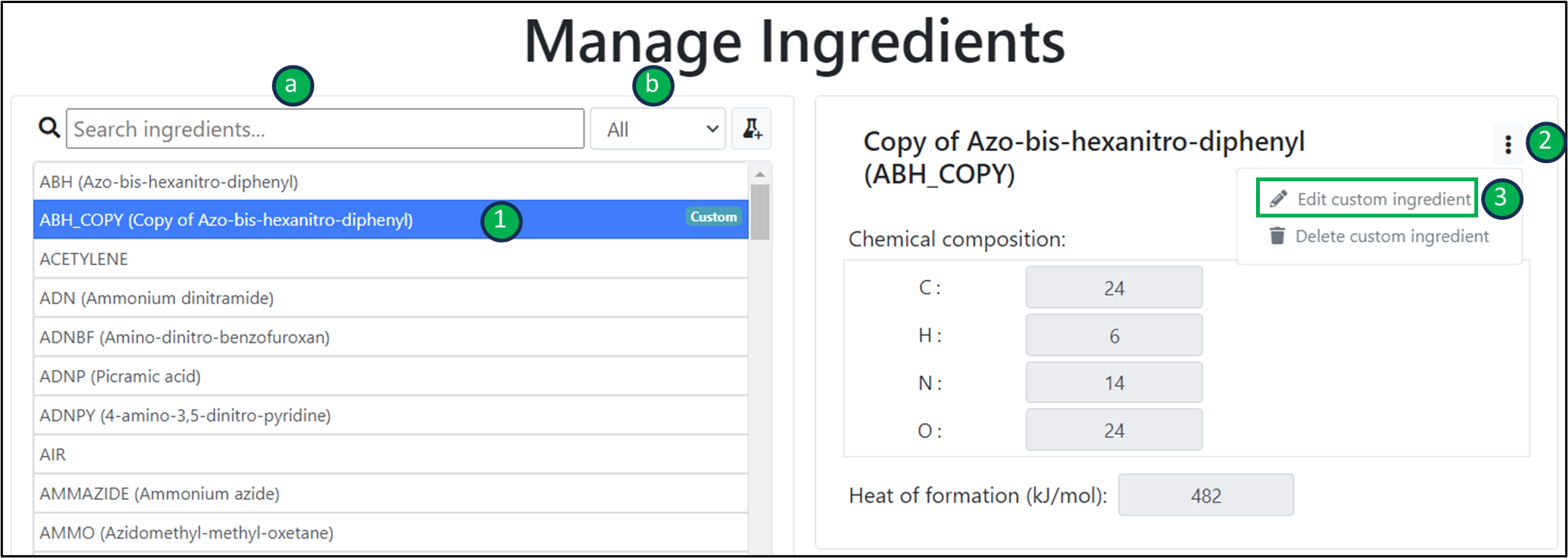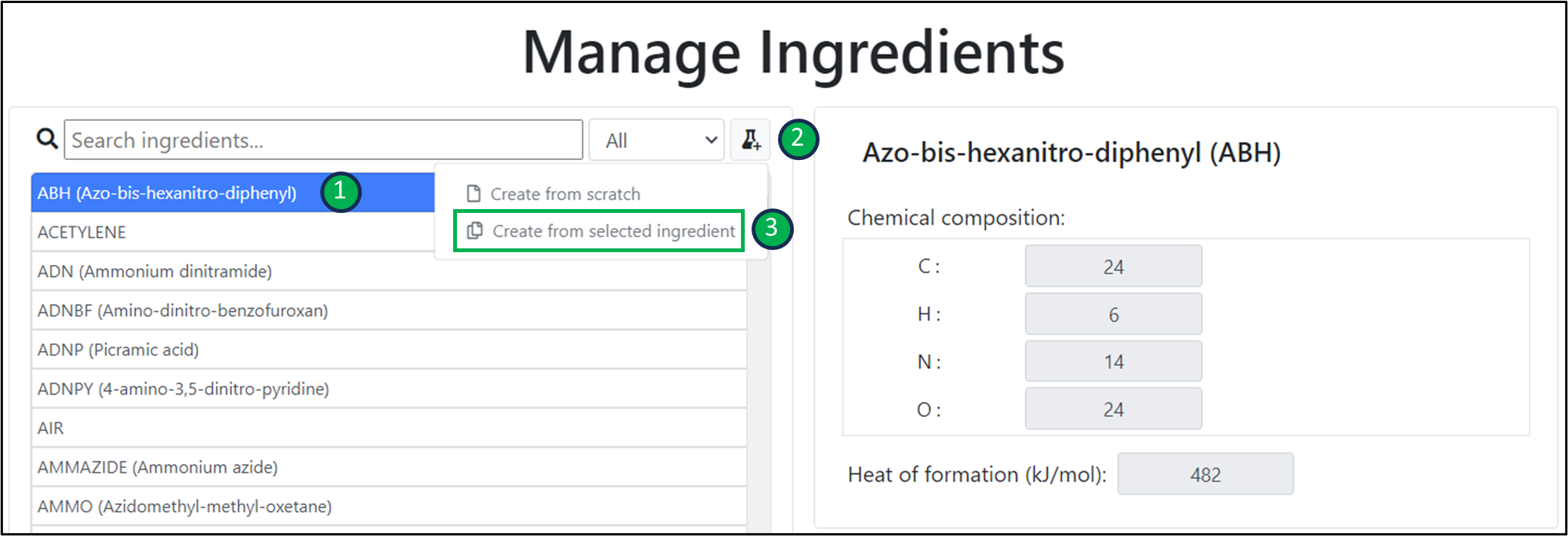 After selecting an ingredient from the list, its properties will appear in a card, on the right of the page.