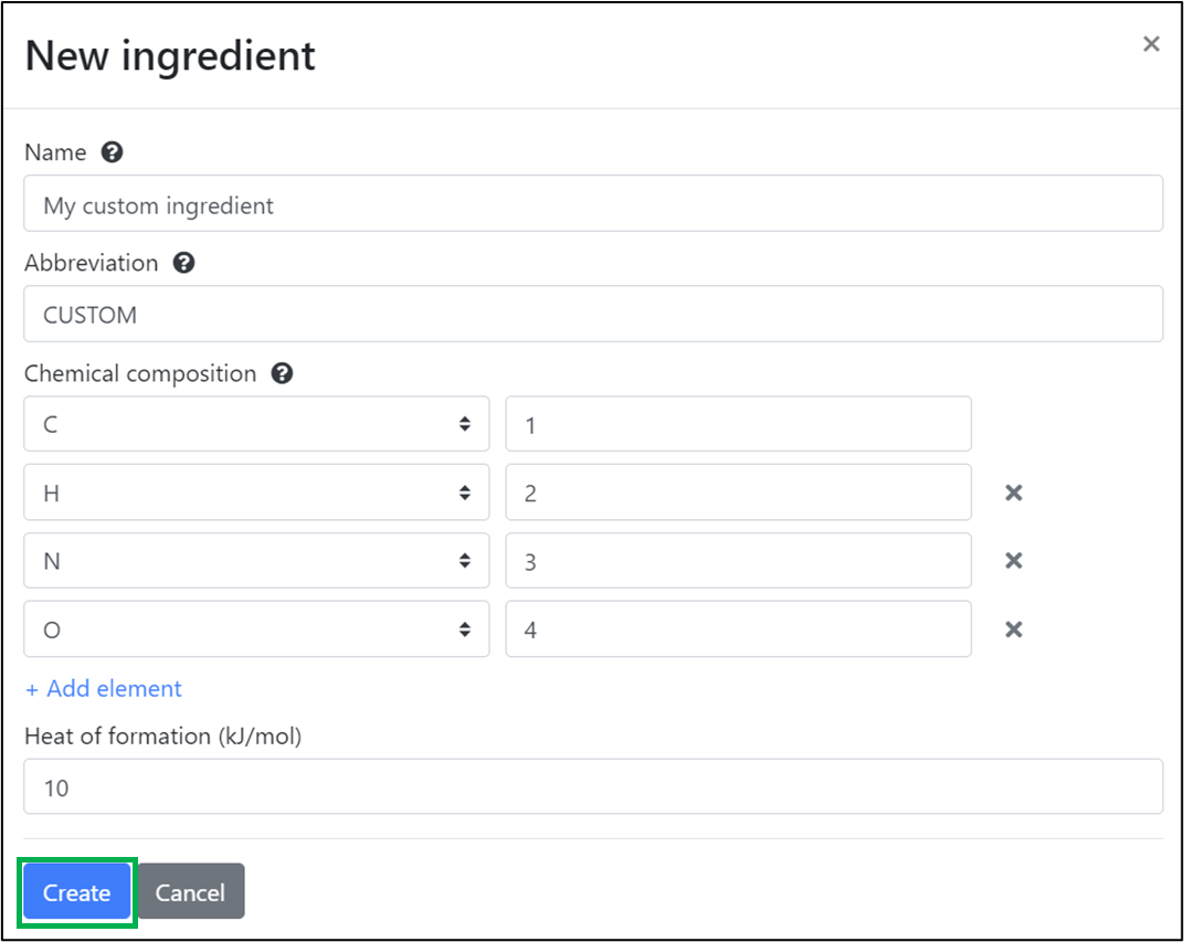 Click on the ‘Create’ button, to create your new custom ingredient.