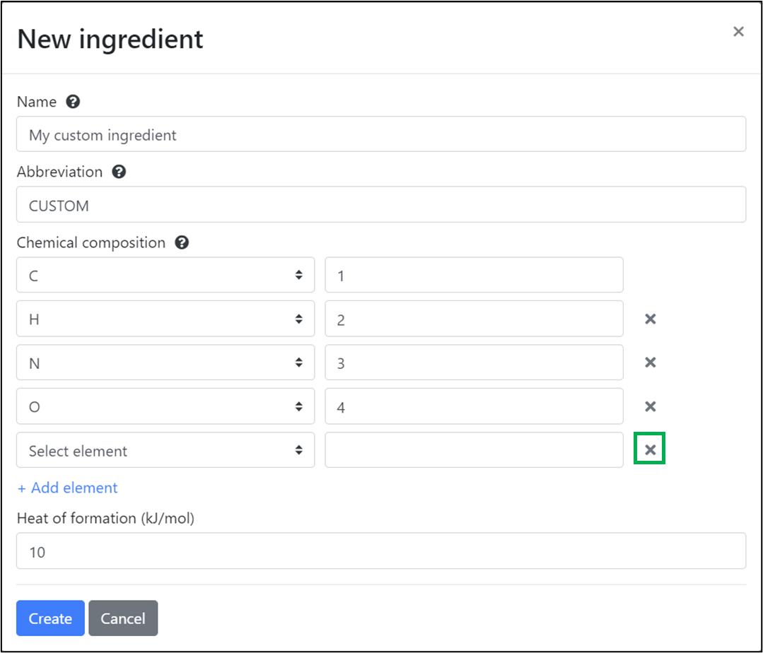 Deleting a chemical element entry in the new ingredient window.