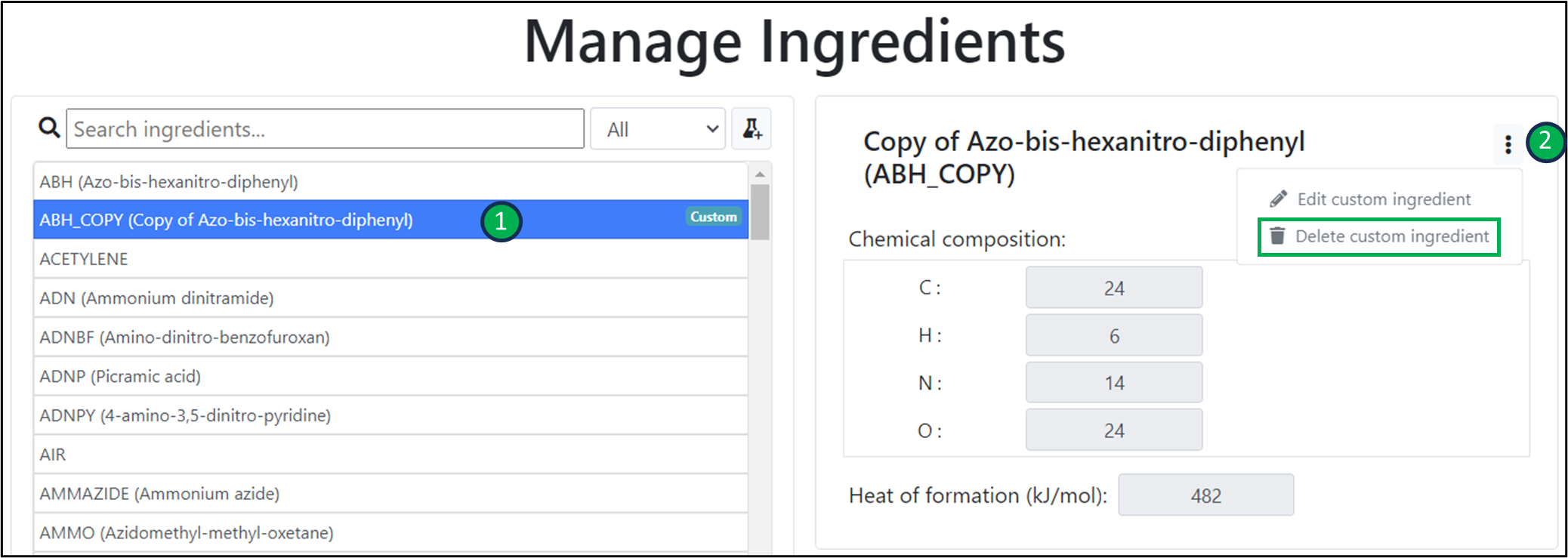 - Select the ‘Delete custom ingredient’ option.