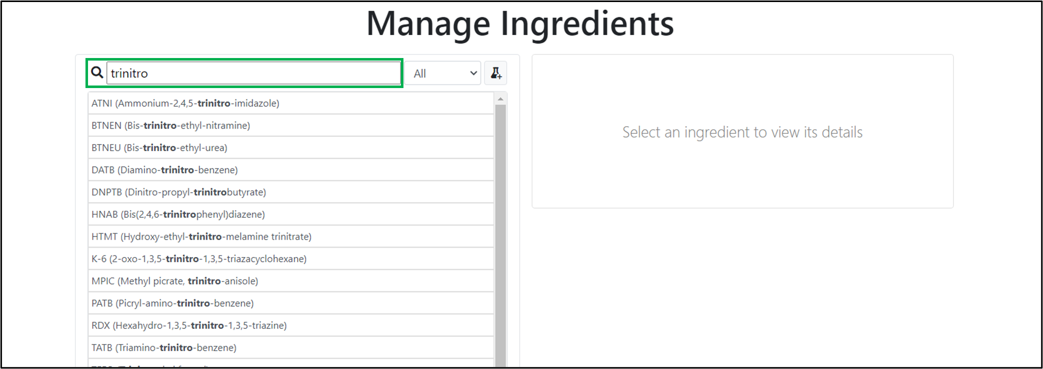 You can search for existing ingredients by using the search bar. After typing a keyword, a search through the names and abbreviations of all existing ingredients will be carried out and the results will be displayed in the ingredients list.