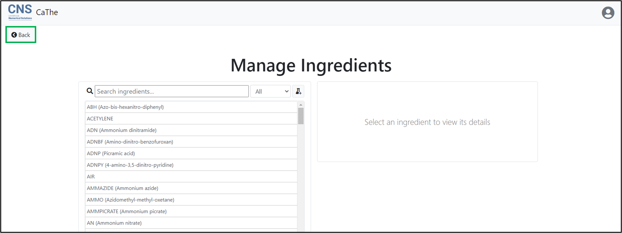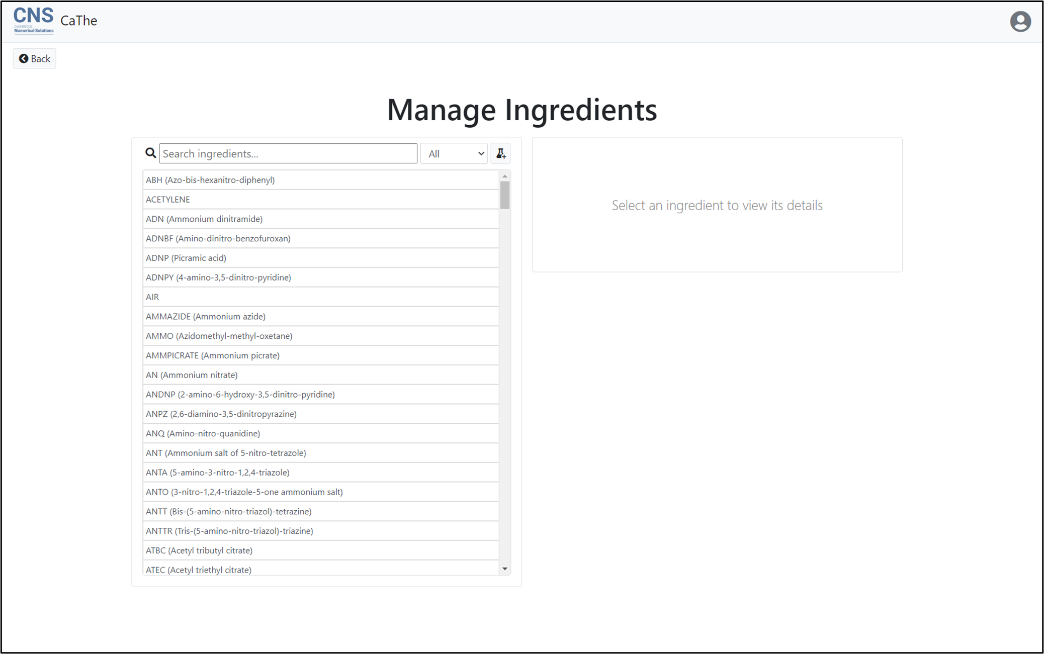 The CaThe module of the Cambridge Numerical Solutions (CNS) platform includes a built-in list of ingredients, but also provides users the ability to create and customize their own ingredients. This tutorial explains how to create and manage custom ingredients, starting from the ‘Simulations’ page. For instructions on accessing the ‘Simulations’ page, see the tutorial ‘Performing a simulation from scratch’.