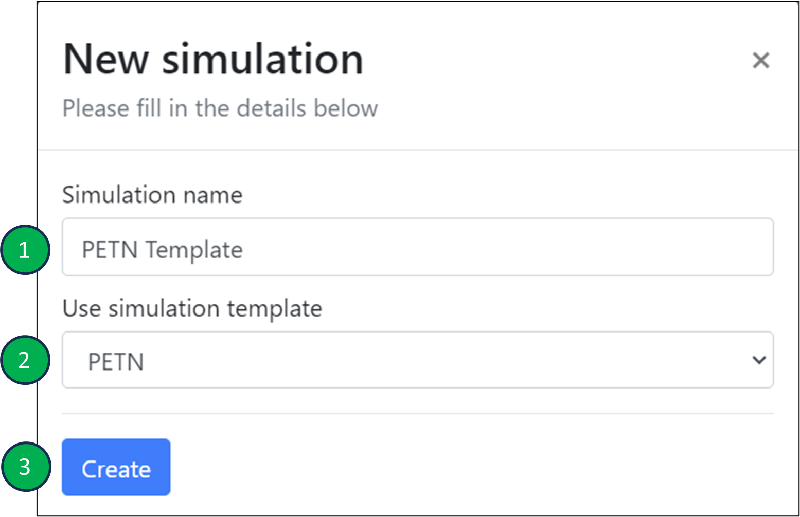 - In the ‘Simulation name’ field, enter the name that you would like to use for the simulation (e.g. ‘PETN Template’).