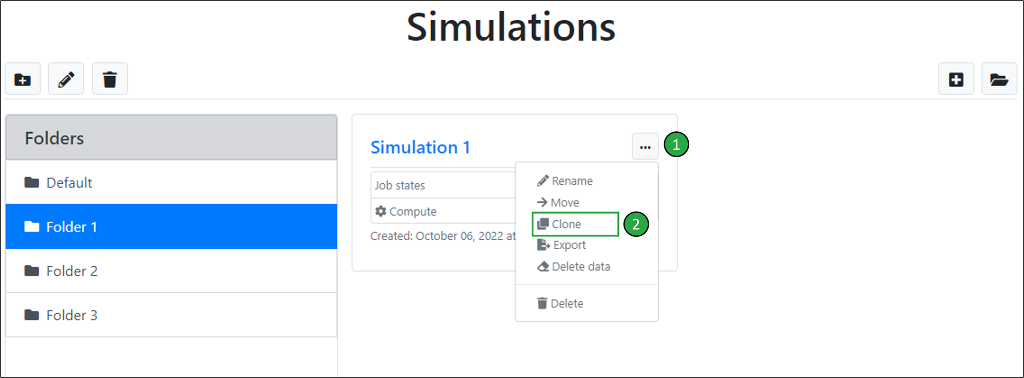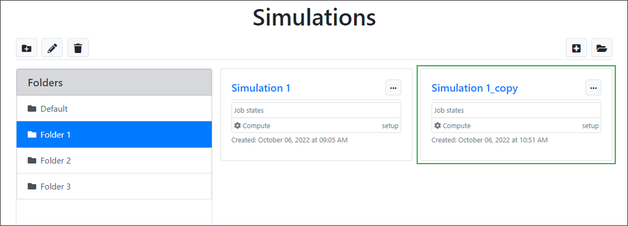 The cloned simulation will be displayed in the list of simulations for the folder.