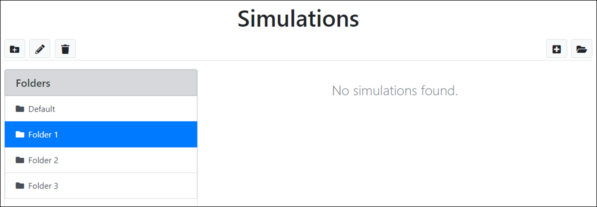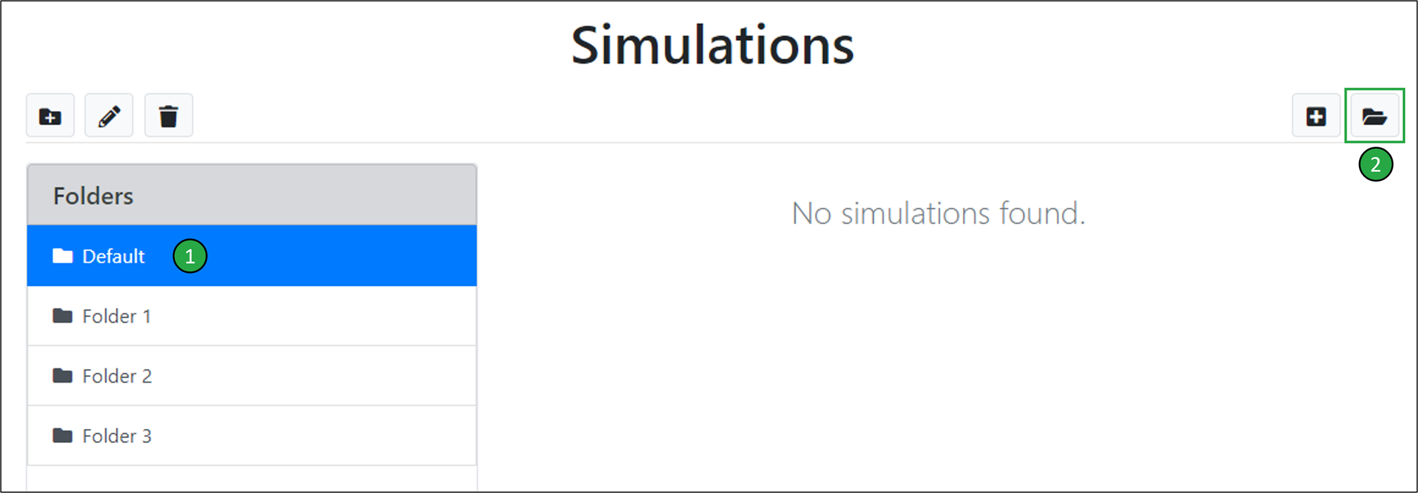 Your account will always contain a ‘Default’ simulation folder into which simulations for this module can be created. It is possible to create a new folder by clicking on the ‘New folder’ button.