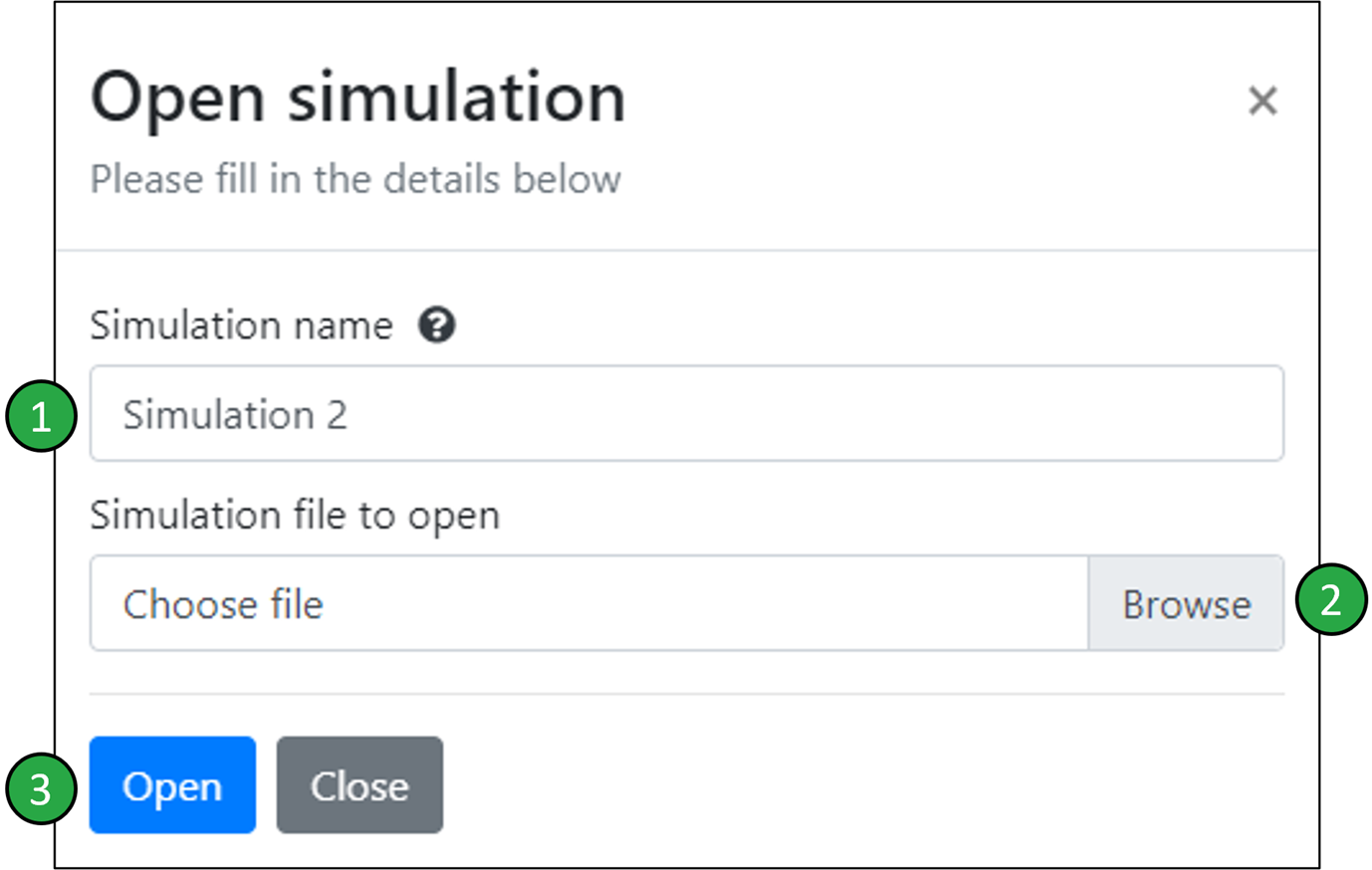 - In the ‘Simulation name’ field, enter the name that you would like to assign to the simulation that you wish to open (e.g. ‘Simulation 2’).
