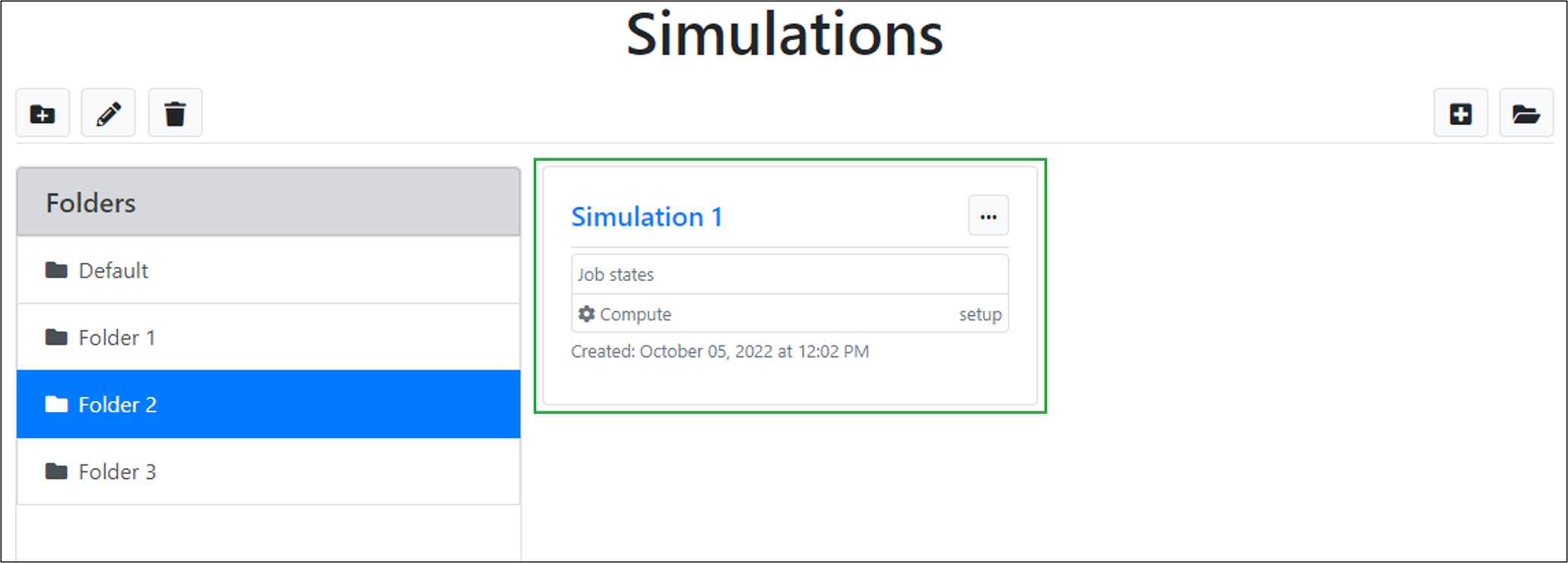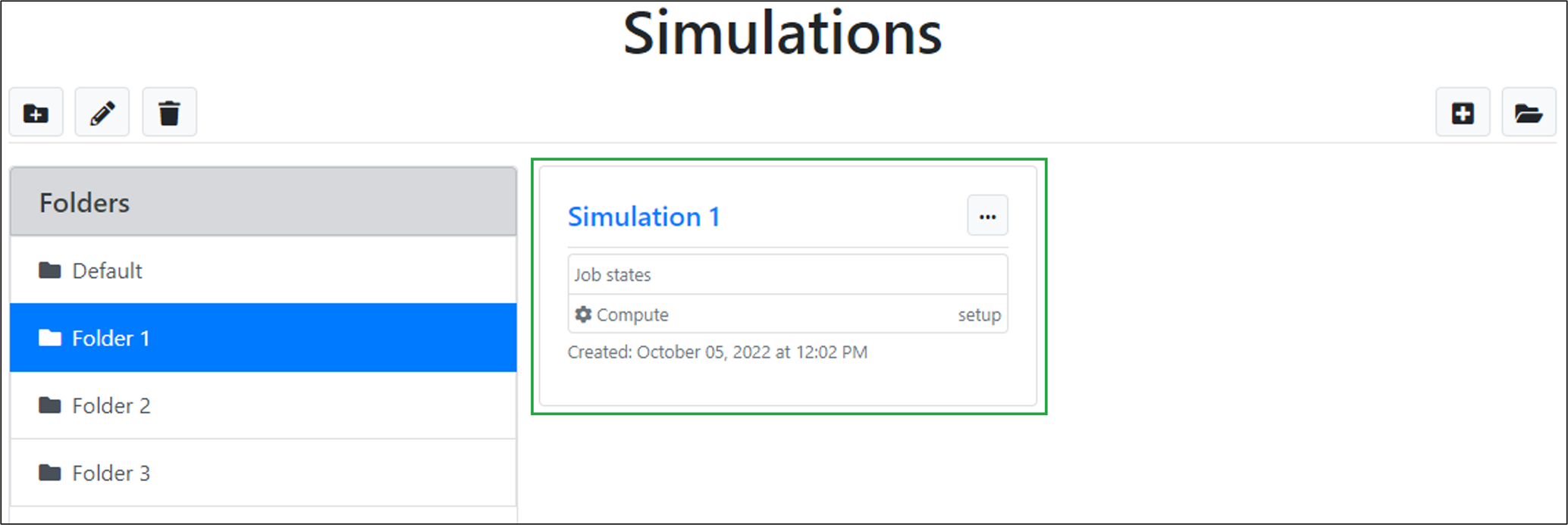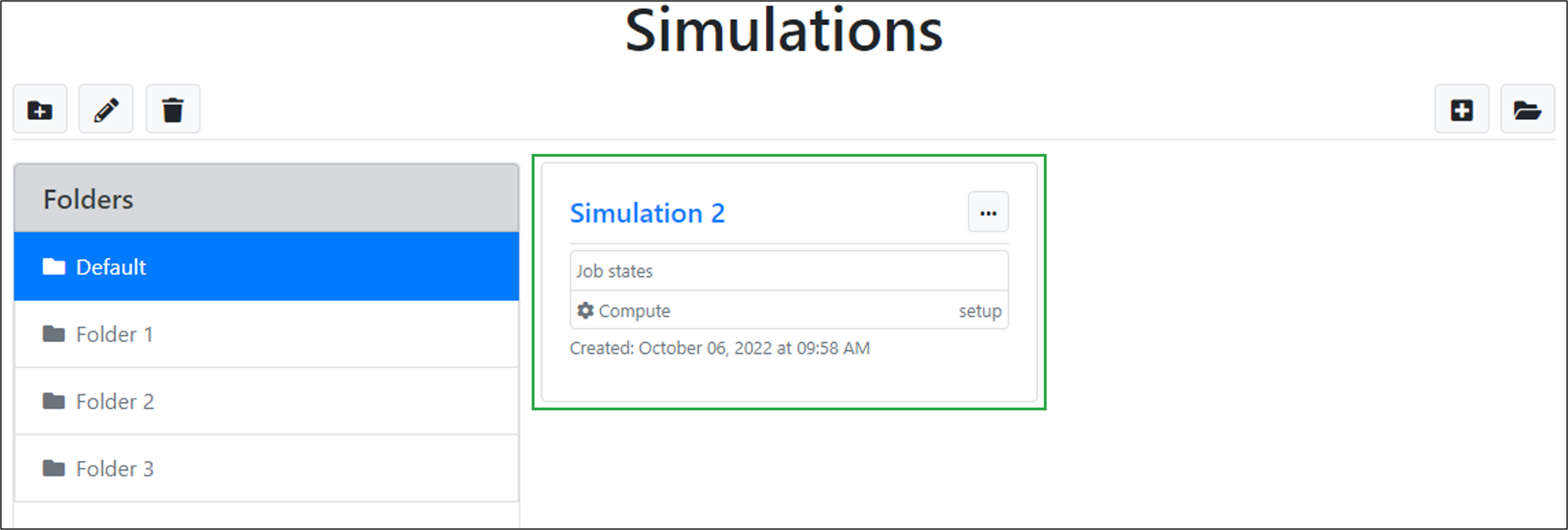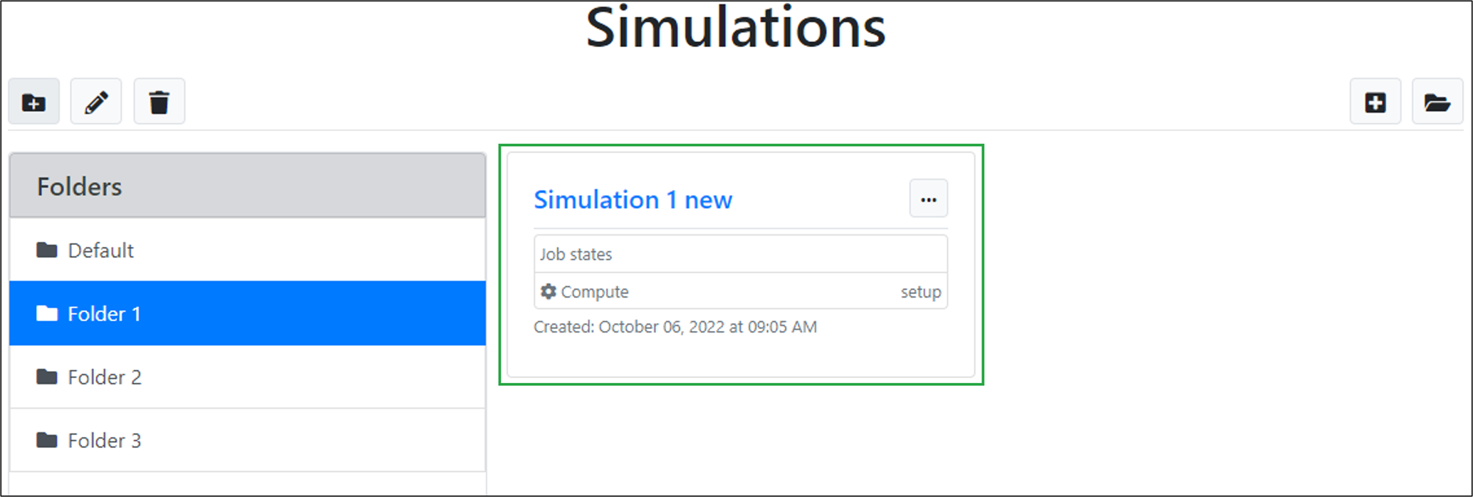 The newly created simulation will appear in the list of simulations for the selected folder: