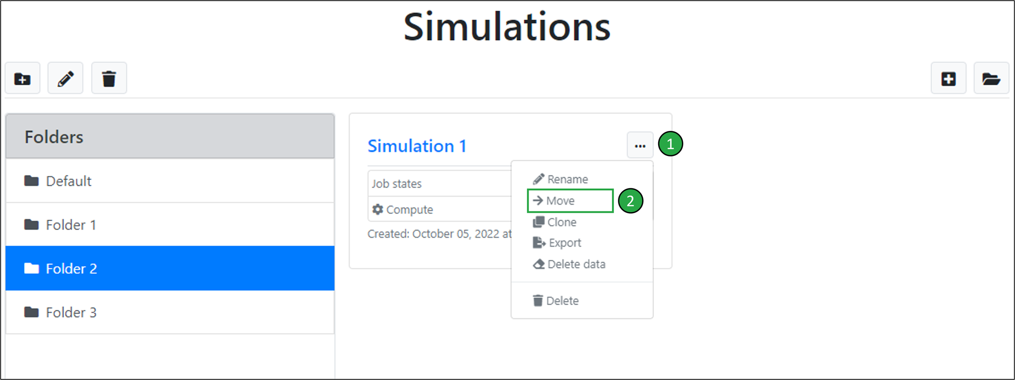 To move an existing simulation (e.g. ‘Simulation 1’) from its current folder (e.g. ‘Folder 2’) to another folder (e.g. ‘Folder 1’):