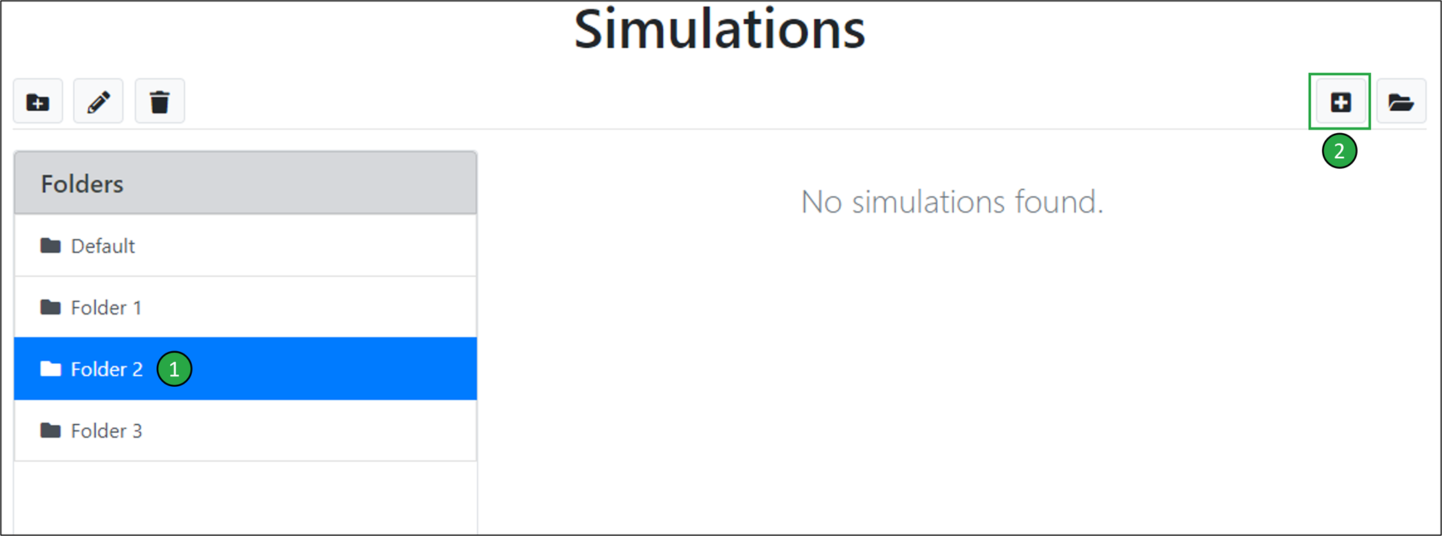 To create a new simulation within a simulation folder (e.g. ‘Folder 2’):