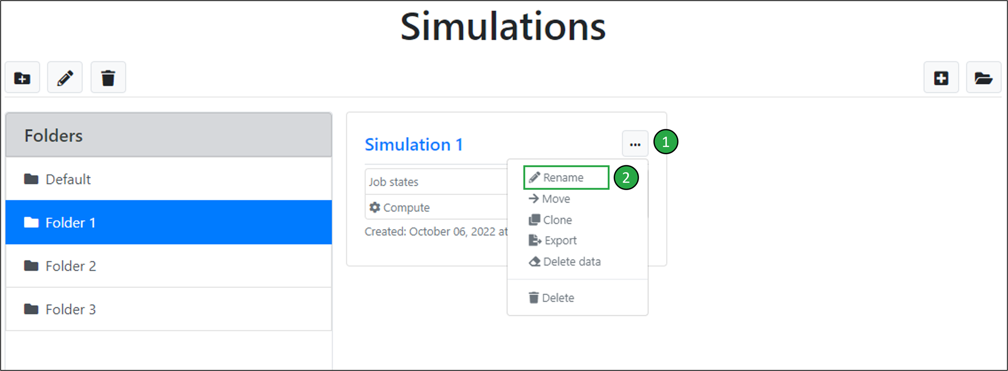 Please note that only empty folders, i.e. folders with no simulations inside them, can be deleted. Furthermore, the ‘Default’ folder cannot be deleted.